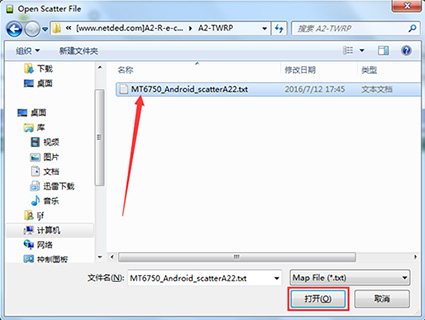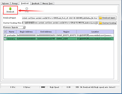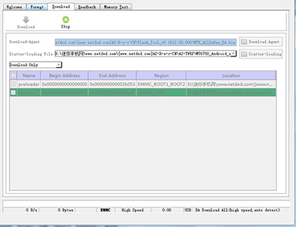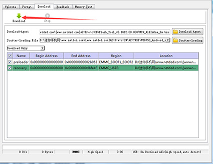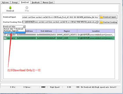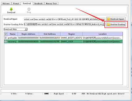 7:再次點擊Scatter-loading按鈕,選擇文件:文件夾A2-TWRP裡面的MT6750_Android_scatterA22.txt,軟件會自動勾選識別到的刷機文件,確認下載方式為:Download Only,然後點擊【Download】按鈕。
