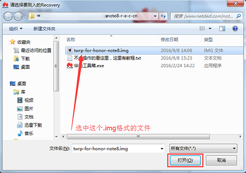 3:然後把上面下載下來的recovery工具包在電腦上進行解壓,解壓出來一個文件夾,然後在文件夾裡找到【華為工具箱.exe】文件直接雙擊打開運行,然後點擊【刷寫Recovery】的按鈕並選擇剛才解壓出來的img格式的recovery文件,點擊確定之後軟件就會自動給手機刷入Recovery了。