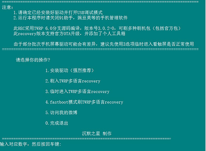 注意:請不要使用此recovery來卡刷任何ROOT單刷包(如SuperSU、kingroot、superuser),請不要使用此recovery來卡刷任何開啟init.d的單刷包,否則必死。