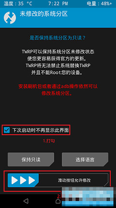 4、刷入完成後,手機將自動進入recovery後選擇“滑動按鈕允許修改”即可,如下圖所示: