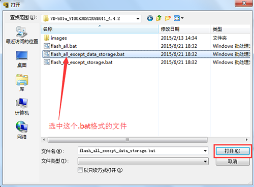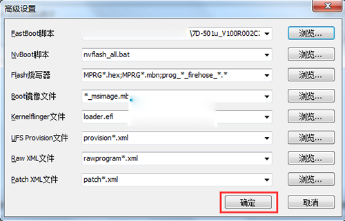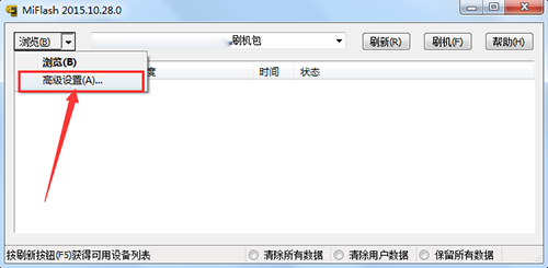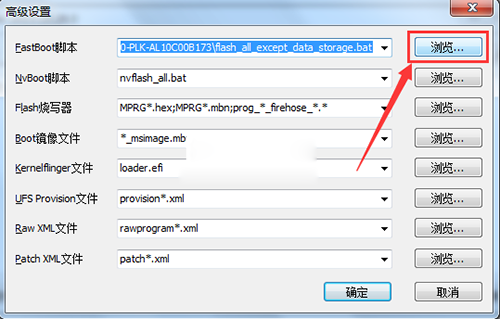 6:然後點擊浏覽按鈕旁邊的小箭頭,選擇高級設置,找到你剛才解壓出來的線刷包的rom文件夾裡的【flash_all_except_data_storage.bat】文件,然後點擊確定。