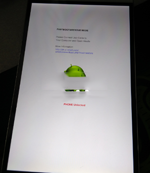 3:接下來手機要進入FastBoot模式,進入的方法:在手機關機狀態下,按住音量減少和電源鍵,當屏幕中出現一只安卓機器人則已經進入FastBoot模式,如下圖所示: