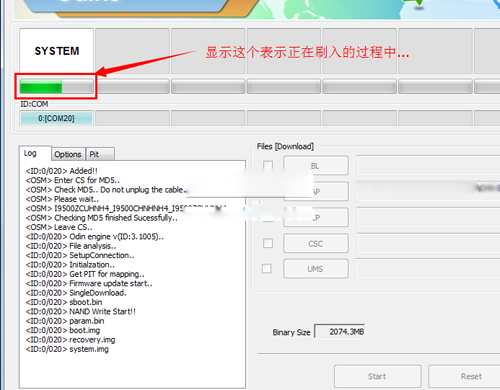 4:打開odin軟件之後軟件會自動識別你的手機,識別成功後會在ID:COM處顯示藍色的表示手機連接成功了,如果沒有顯示藍色的,說明沒有有連接好,然後分別點擊相應的按鈕選擇相應的rom文件。