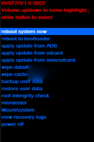 4:手機在關機狀態下,同時按電源鍵,和音量上鍵,兩個組合鍵長按至屏幕點亮後即放開按鍵,約8秒後手機會先進入recovery界面。
