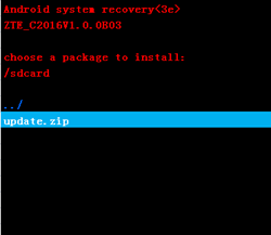 5:按音量下鍵選擇“update.zip”升級包,按開機鍵確認,手機開始升級。