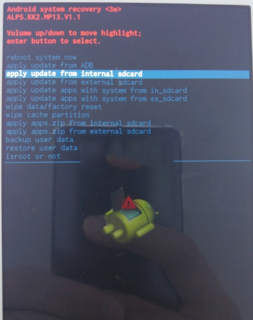 6:按音量鍵選擇復制到手機SD卡裡的固件包,點擊鎖屏鍵,進入升級界面,如下圖所示,在升級過程中請耐心等待。