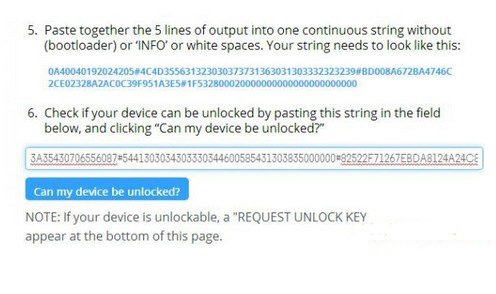 7、登陸成功後,在頁面的中間,注意看,在這裡粘貼剛才記事本粘貼的解鎖數據,並刪除之間的空格後,點擊Can my device be unlocked?按鈕後將會驗證一下IMEI信息,確定你的手機是否可以解鎖BL。
