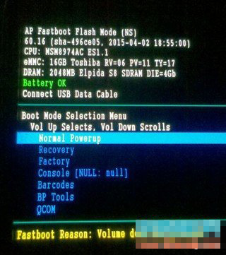 1、先把手機完全關機,然後同時按下音量減鍵和開機鍵不放3秒後松開,手機就會進入fastboot模式。如下圖所示: