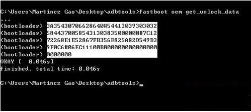 9、然後把手機關機,進BL模式,同時按下音量減鍵和開機鍵3秒後松開,連接電腦 ,重新打開命令提示符。輸入:fastboot oem unlock 你的解鎖碼,例如:fastboot oem unlock PVSNIA4K66QWFWZKBCHM 回車後你的手機屏幕左上角將會提示unlocking,表示正在解鎖中。