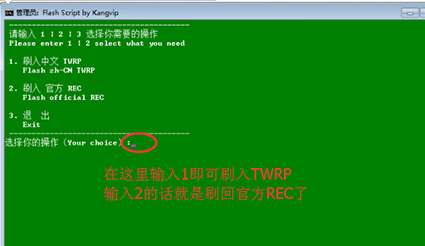 3:在工具界面中按提示操作就可以了,(如果是刷回官方原版Recovery,請按圖所示選擇2回車)。