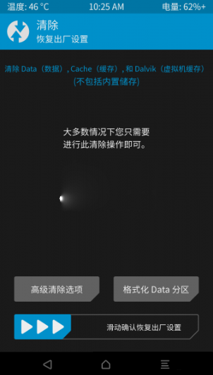 3:刷入ROM之前建議清空用戶數據,即清空data分區下的文件,請務必做好重要數據備份工作,比如聯系人、短信、已安裝軟件等,內置存儲中的文件將不會被清除,相當於恢復出廠設置,操作方法是:點擊 “清除”,滑動下方的按鈕 “滑動按鈕開始執行”,很快就完成了該操作,一直點右下角返回箭頭,即可返回 Recovery主界面。