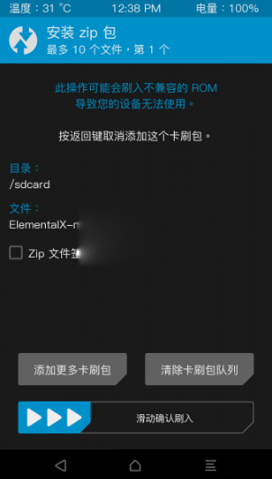 4:清理完成之後返回到recovery主界面,點擊 “安裝”,即可進入系統目錄選擇文件。選擇“選擇存儲器”可以切換內外存儲器,找到剛剛准備好的zip格式rom包,點擊它,然後滑動下方按鈕“滑動確認刷入。