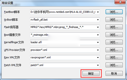 6:然後點擊浏覽按鈕旁邊的小箭頭,選擇高級設置,找到你剛才解壓出來的線刷包的rom文件夾裡的【flash_all_except_data_storage.bat】文件,然後點擊確定。