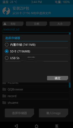 4:清理完成之後返回到recovery主界面,點擊 “安裝”,即可進入系統目錄選擇文件。選擇“選擇存儲器”可以切換內外存儲器,找到剛剛准備好的zip格式rom包,點擊它,然後滑動下方按鈕“滑動確認刷入。