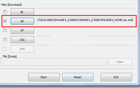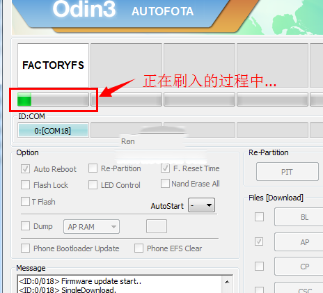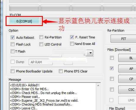 4:打開odin軟件之後軟件會自動識別你的手機,識別成功後會在ID:COM處顯示藍色的表示手機連接成功了,如果沒有顯示藍色的,說明沒有有連接好,然後勾選AP,選擇上面下載並解壓出來的tar格式的文件包。