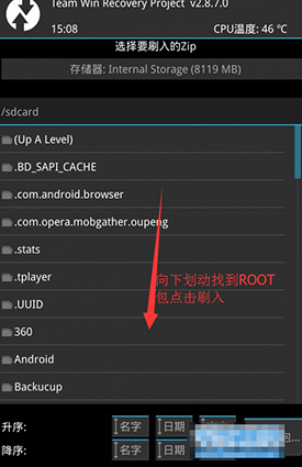 3:點擊【安裝刷機包】進入存儲目錄下,找到你放root包的位置,然後點擊【SuperSU_for_6.0.zip】開始刷入: