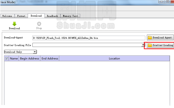 2、點擊工具右側的【Scatter-loading】,選擇在准備工作第1步中的解壓好的中興遠航3 Q529官方rec線刷文件包目錄中的【MT6735_Android_scatter....txt】文件: