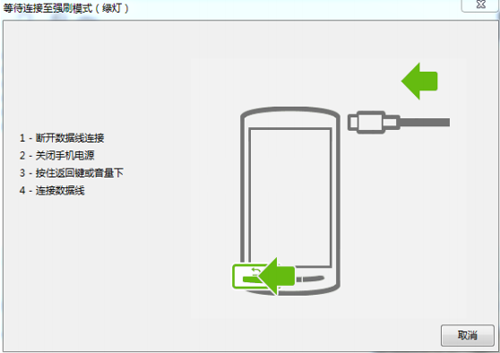 1:手機先進入強刷模式,也就是綠燈模式,方法:手機在關機狀態下,按住音量下-鍵的同時用數據線連接至電腦,手機上角出現綠燈即表示進入成功。