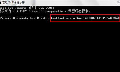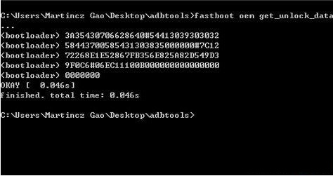 9、然後把手機關機,進BL模式,同時按下音量減鍵和開機鍵3秒後松開,連接電腦 ,重新打開命令提示符。輸入:fastboot oem unlock 你的解鎖碼,例如:fastboot oem unlock PVSNIA4K66QWFWZKBCHM 回車後你的手機屏幕左上角將會提示unlocking,表示正在解鎖中。