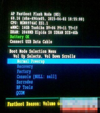 3:把手機進入fastboot模式(和解鎖時進入的一樣,即關機狀態下,長按音量—鍵和電源鍵同時按住2秒後松開)再連接電腦: