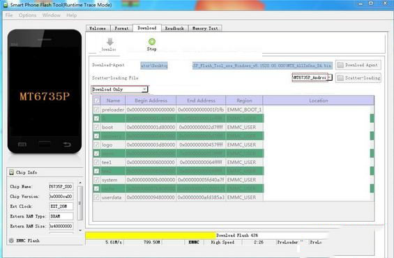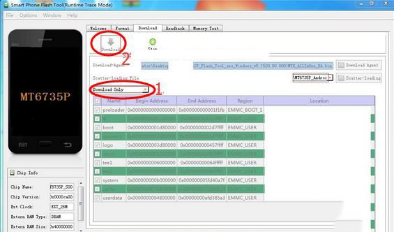 4:確保如下圖第1那裡的下載方式為Download Olny,然後點擊中興Q519T線刷工具左上方的向下箭頭【download】後,然後把手機關機,當手機關機後馬上連接電腦,如下圖線刷開始了,如果連接電腦後手機開機了,請直接關機即可開始。