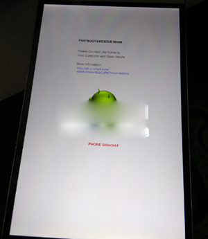 3:接下來手機要進入FastBoot模式,進入的方法:在手機關機狀態下,按住音量減少和電源鍵,當屏幕中出現一只安卓機器人則已經進入FastBoot模式,如下圖所示: