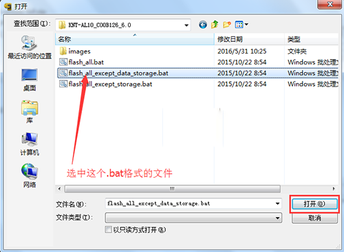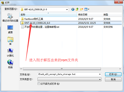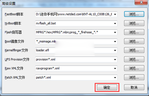6:然後點擊浏覽按鈕旁邊的小箭頭,選擇高級設置,找到你剛才解壓出來的線刷包的rom文件夾裡的【flash_all_except_data_storage.bat】文件,然後點擊確定。