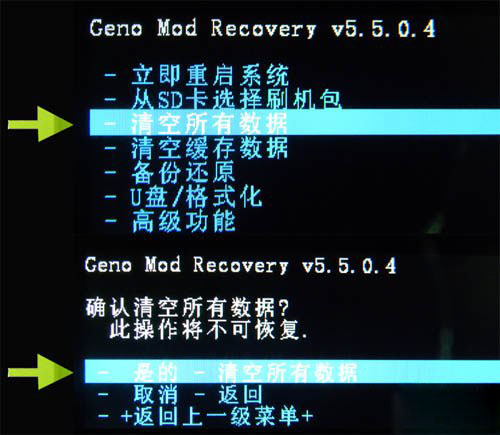 3:用音量鍵選擇【清空所有數據】然後再選擇【是的-清空所有數據】然後按電源鍵確認。