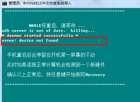 5:然後一直按回車鍵就可以了,如果出現下圖的“device not found”的話,說明數據線沒有連接好電腦,或著電腦上驅動沒有安裝好,請仔細檢查一下。