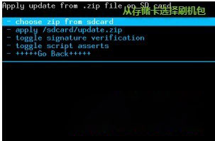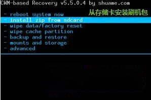 5、開始刷機,install zip from sdcard從存儲卡安裝刷機包,choose zip from sdcard從存儲卡選擇刷機包。