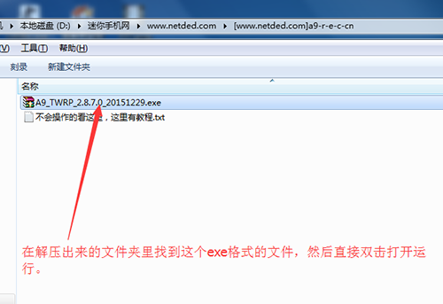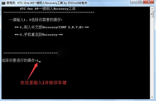 3:然後把上面下載下來的recovery工具包在電腦上進行解壓,解壓出來一個文件夾,然後在文件夾裡找到【A9_TWRP_2.8.7.0_20151229.exe】文件直接雙擊打開運行,然後輸入1並按回車鍵就可以了。