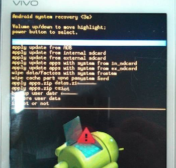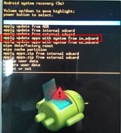 6:按音量-選擇apply update apps with system from in_sdcard,再點擊鎖屏鍵進入選擇菜單,如圖所示: