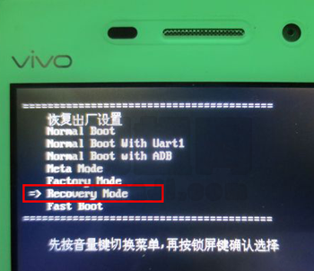 4:按音量鍵選擇Recovery Mode,再按鎖屏鍵進入Recovery Mode,看到以下畫面說明成功進入Recovery Mode,耐心等待5秒左右,【recovery中按鍵操作說明:音量+ -分別為上下選擇鍵 ,鎖屏鍵為執行鍵(確認鍵)】。