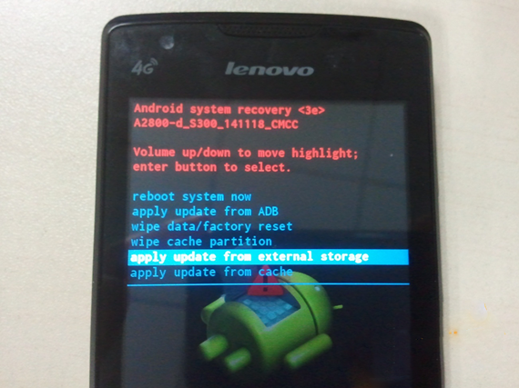 3、出現步驟2圖片界面後,按volume鍵,出現菜單列表,如下圖,按volume下鍵移動到apply update from external storage項,按power鍵確認。