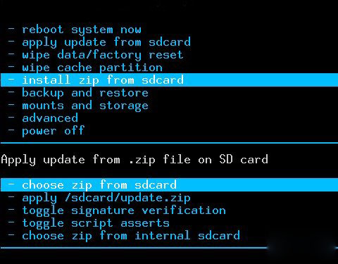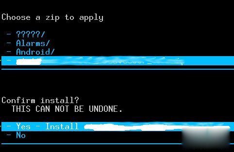 4:然後按音量鍵選擇install zip from sdcard並確認,然後再選擇choose zip from sdcard並確認,然後在列表中找到剛才放到手機sd卡根目錄下的rom包,然後按HOME鍵確認,Yes-install XXXXX,確認後開始刷機。