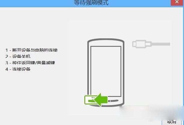5.最後軟件提示等待連接手機的時候我們在手機在關機狀態下按住【音量下鍵】通過數據線連接電腦,軟件識別後自動進行刷機。