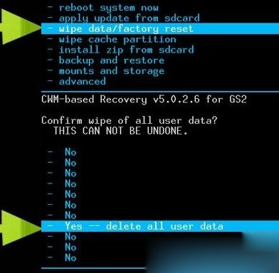 4. 在Recovery模式下,音量鍵為選擇,電源鍵為確認,首先選擇“wipe data/factory reset清空DATA/恢復出廠設置'選項,並在接下來的確認選項中選擇"yes,chose wipe data是,選擇清空data"的選項,如下圖所示: