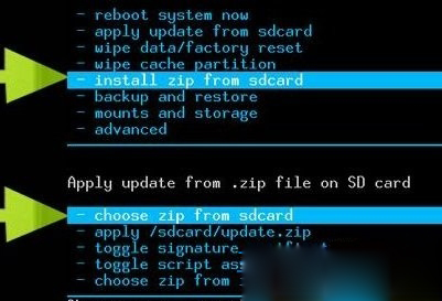 6. 完成之後,選擇“nstall zip from sdcard從SD卡選擇更新”選項,並接著選擇“chose zip from sdcard從SD卡選擇升級包更新”,如下圖所示: