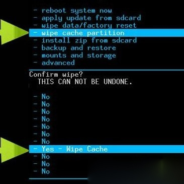 5. 接著選擇"wipe cache partition清空CACHE分區"選項,並在接下來的確認選項中選擇"yes,wipe cache是,清空CACHE分區”的選項,如下圖所示: