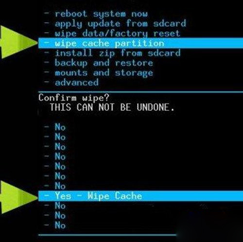 5.鍵選“wipe cache partition”後選擇“Yes”,清空CACHE分區。
