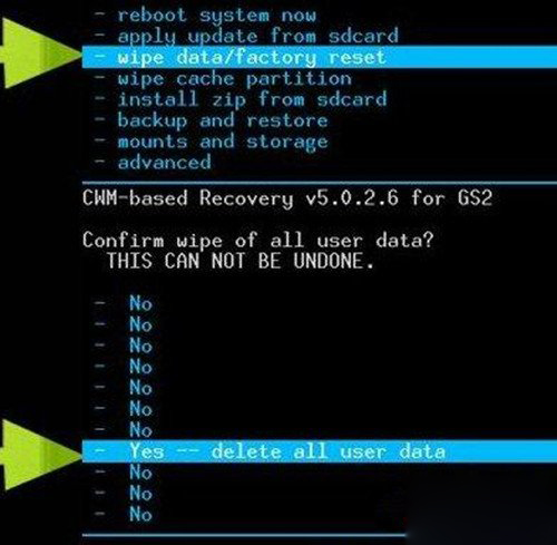 4.鍵選“wipe data/factory reset”後選擇“Yes”,清空DATA/恢復出廠設置。