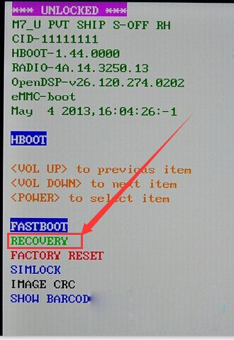 2.在關機狀態下,按住音量減鍵+電源鍵,直至進入hboot模式,再按音量鍵選擇“Recovery”選項,電源鍵確認後即可進入Recovery模式。