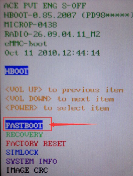 4.以上都准備好之後,手機關機,同時按住音量-和電源鍵,等待幾秒就進入HBOOT界面了,然後再選擇第一個FASTBOOT,然後手機連接電腦。