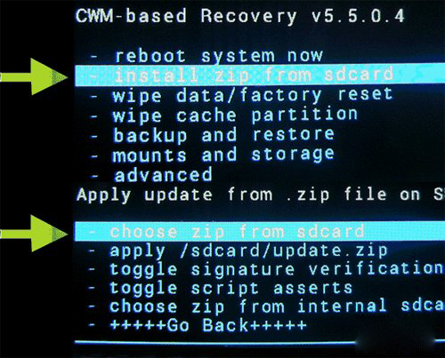 3.然後返回,選擇“install zip from sdcard”(從SD卡選擇刷機包),確認,然後再按音量鍵選擇 choose zip from sdcard(從SD卡上選擇zip文件),然後確認,接下來按音量鍵移動光標找到之前放入SD卡根目錄的刷機包,確認刷機。