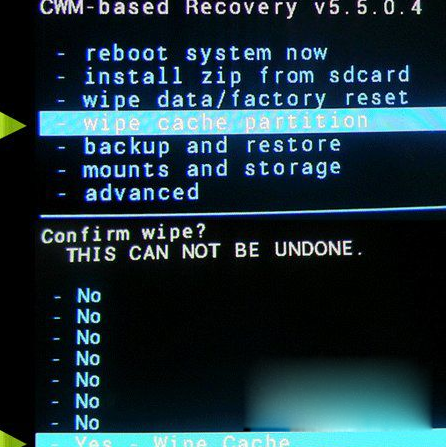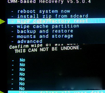 2.進入recovery之後,先進行雙清,按音量鍵選擇“wipe data/factory reset(清空所有數據)——Yes——delet all user data(是的-清空所有數據)”和“wipe cache partition(清空所有緩存)——Yes--Wipe Cache(是的-清空所有緩存)。