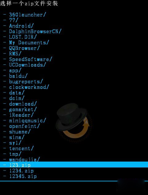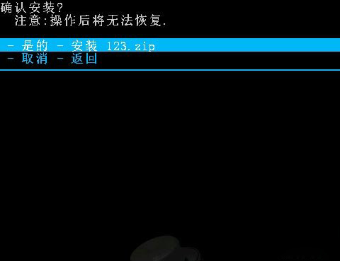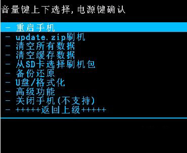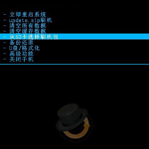 6:然後回到recovery的主界面,再按音量鍵選擇“從SD卡選擇刷機包”,用電源鍵確認,再選“從SD卡選擇ZIP文件”,用電源鍵確認,在列表中找到剛復制到手機sd卡根目錄下的zip格式刷機包,然後用電源鍵確認。