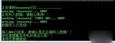 6:顯示“刷入REC已結束,請確認是否正確寫入數據”,刷機完成,任意鍵重啟手機並退出工具。