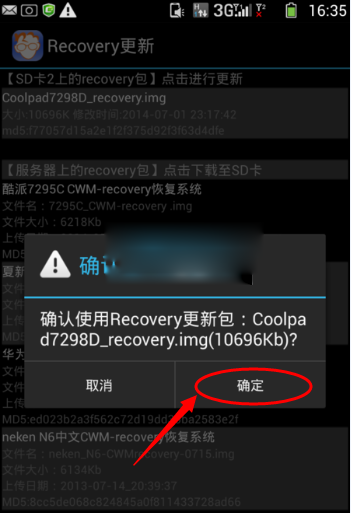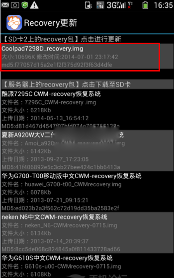 6:如果您已經將【Coolpad7298D_recovery.img】文件復制到了手機SD卡上的話,那麼,此時軟件列表裡就應該會顯示【Coolpad7298D_recovery】,直接點擊並且確認更新。