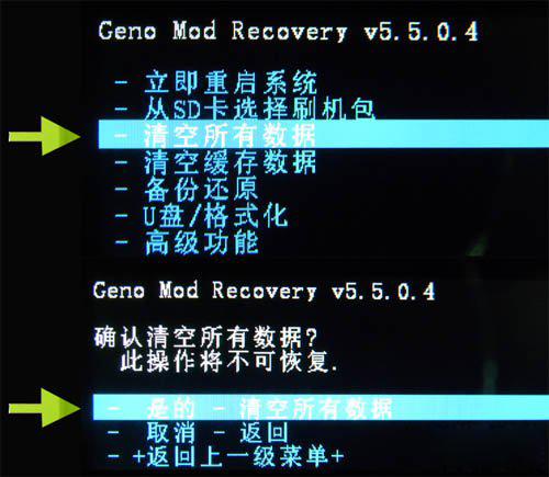3:用音量鍵選擇【清空所有數據/恢復出廠設置】,然後再選擇【是的-清空所有數據】,然後按電源鍵確認。