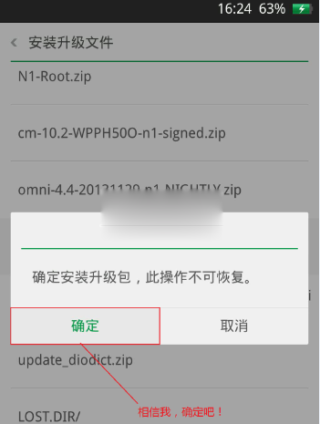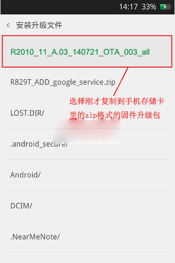 5:接下來選擇剛才復制到手機存儲卡根目錄下的zip格式的升級包,然後選擇確定,接著就開始安裝啦。